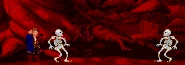 On Booty Island, while attempting to climb the Big Tree, Guybrush fell unconscious. In what seemed to be a hallucination, his parents appeared, Guybrush accused them for abandoning him, and then transformed into skeletons and sang The Bones Song. The song turned out to be coded information on how to safely get through the many corridors of LeChuck's Fortress.