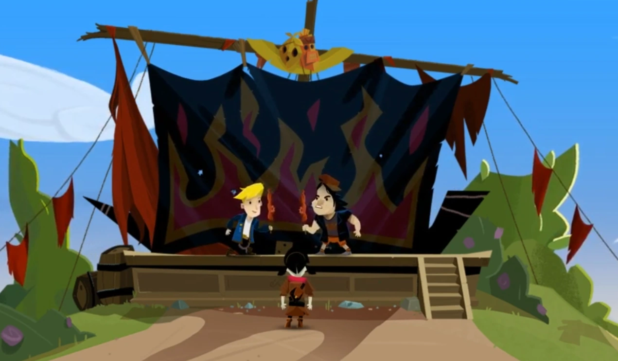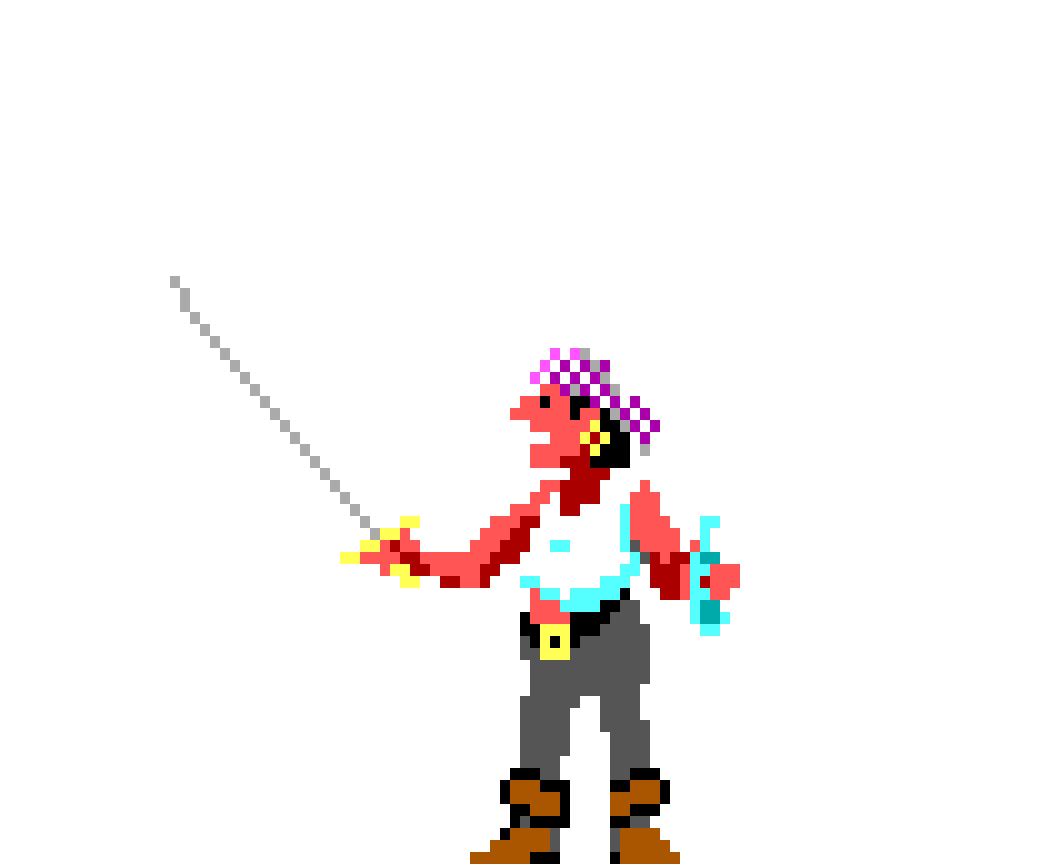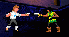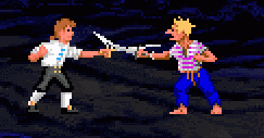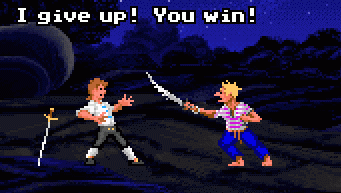 In The Secret of Monkey Island Guybrush Threepwood must defeat the Sword Master of Mêlée Island as one of the Three Trials to prove himself worthy of becoming a pirate.
