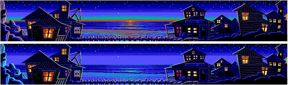 - Only in the PC EGA version of SoMI, at the very start of the game, when Guybrush walks at the dock, the scenery shows a sunset. The sunset is replaced by the starry night sky soon after and remains so for the rest of the game. The sunset code has been removed to all other versions of SoMI (perhaps because it would be difficult to translate the coloring code to VGA and other palettes) and it is already deep night from the beginning of the story.[1]