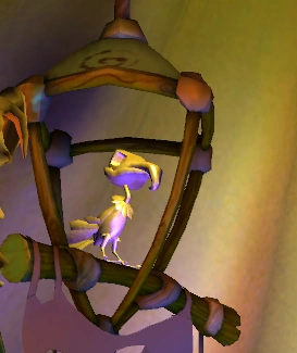 Guybrush sees the parrot on a perch inside of the Voodoo Lady's shack on Flotsam Island. The Voodoo Lady has been trying to train it, but was unfortunately ruined when Guybrush made it mimic his introduction.