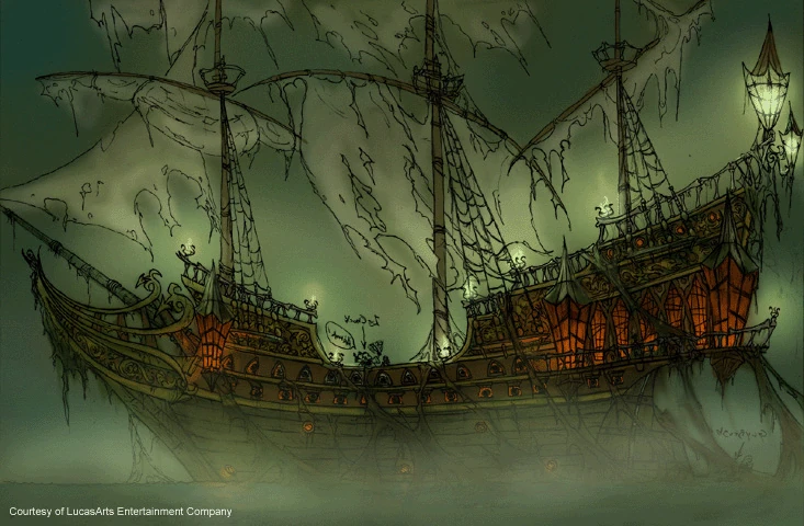 When Guybrush Threepwood escaped from the Carnival of the Damned with a bumper car in the sea, he inadvertently stumbled across the ship, captained by LeChuck, whilst it was engaged in an attack against the Plunder Island Fortress in order to get Elaine Marley.